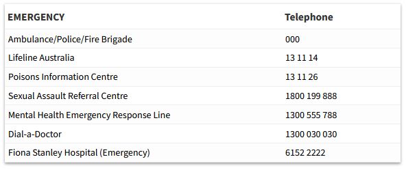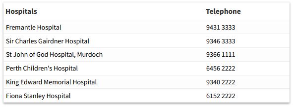 Emergency care can be sought either at St John of God Hospital, Murdoch or Fiona Stanley Hospital.